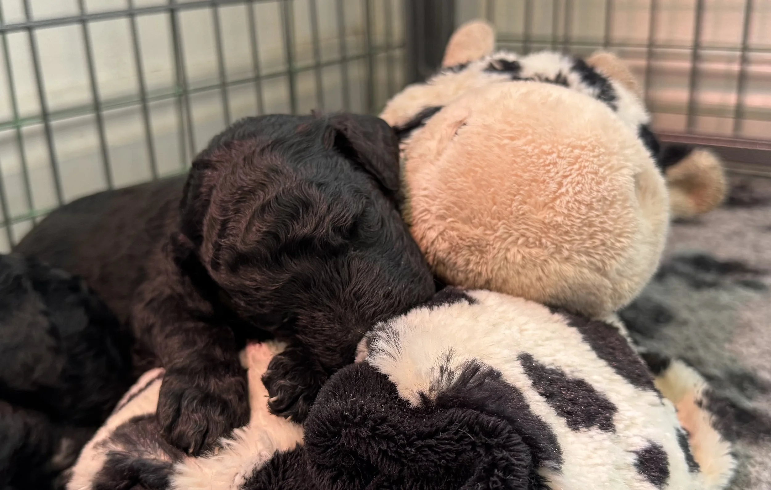 2026-04-04: På självaste påskafton får valparna flytta ut i en lite större hage i köket, eftersom de börjar vara så stora att kan ta sig runt lite mer och behöver fastare mark än den mjuka dynan som ligger i den första valplådan. Här får de mjuka vetbeds att vara på samt tillgång till underlag av tidningar, för att de ska lära sig att kissa och bajsa på dem. Från början är de ostadiga på benen och tidningarna var lite för halkiga för dem, så efter att vi tog den här filmen lade vi ut vetbeds på en lite större yta i hagen. Den minskar vi ner senare när de blir stadigare. Det går fint att vara här också, tycker Ilya.